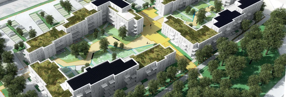 Det nye byggeri opføres som fire boligstænger i to ”sprængte” karréer langs det østlige skel. Bygningerne har forskydninger i facaderne og varierende højder på 3-5 etager. De nye bygninger indeholder et etageareal på knap 17.000 m² bolig fordelt på 196 boliger. I projektet udføres terrænparkering i den vestlige del af området samt i en parkeringskælder under bygningernes gårdrum. Der er skitseret 133 p-pladser på terræn og 176 p-pladser i kælder, i alt 309 p-pladser, hvilket overholder den gældende parkeringsnorm.